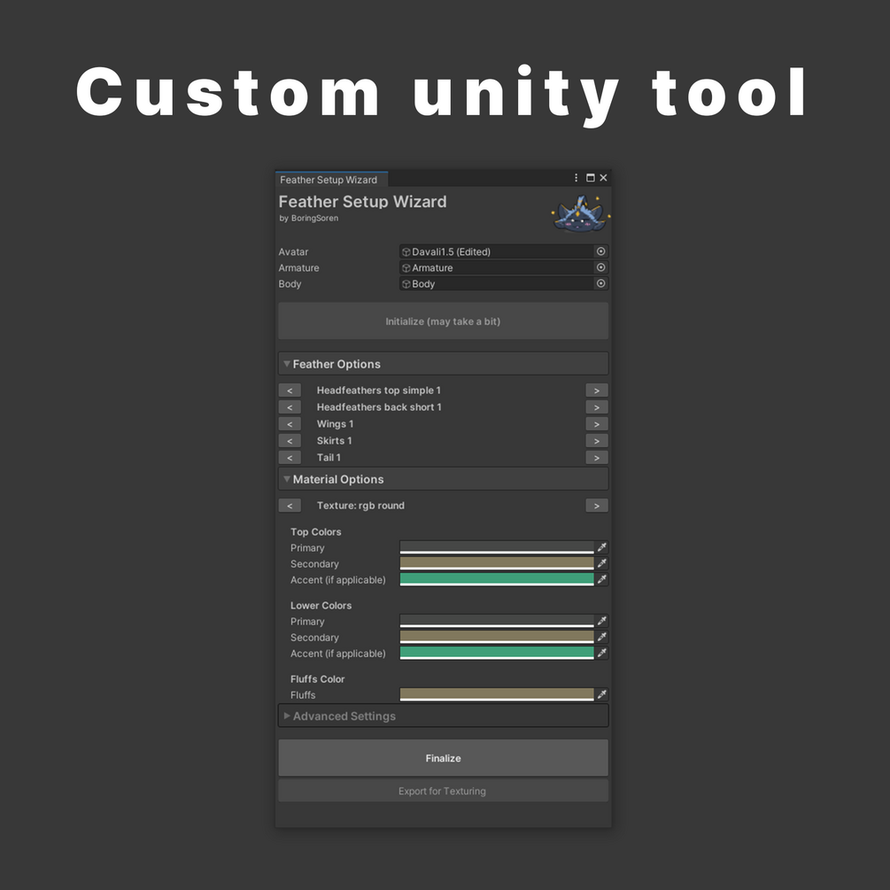 Custom unity tool for easy application inside of unity, with choices for default textures and customizing colors.